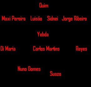 Um verdadeiro benfiquista sofre...... Prova disso foi o jogo de ontem que tive de estar acordado ate as onze horas da noite a sofrer ao lado da minha equipa. Não me importava de nada de acordar mal ou chegar atrasado a escola apenas queria que o Benfica ganhasse, isso bastava para salvar o dia de ontem. Quanto ao jogo o Benfica esteve adormecido na primeira e na segunda parte não tendo criado grandes ocasioes de golo, tirando o remate de Di Maria a barra, nem mesmo com as entradas de Reyes e Suazo o Benfica conseguio resolver a partida e entao o encontro teve de ir para os penaltis, o guardiao Moreira foi o heroi da noite tendo defendido o penalti de Dias, Suazo apenas teve de confirmar a victoria. Aqui deixo mais uma vez as minhas cronicas referentes aos jogadores.